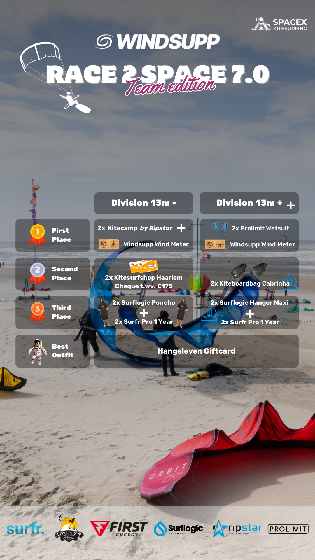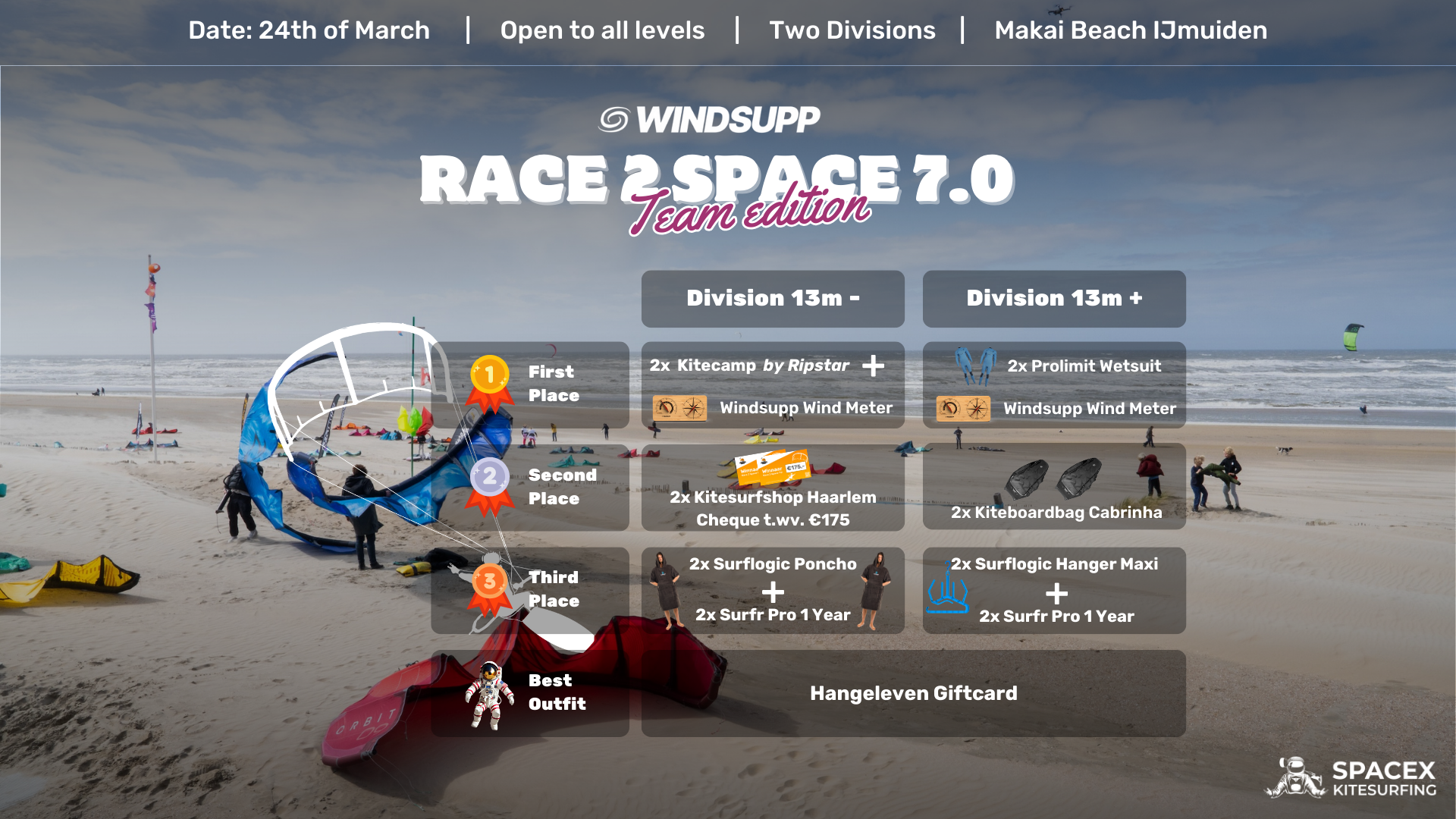 The legendary Race to Space competition is back! This year, the challenge takes place at the Dutch highfly kitespot, IJmuiden, and focuses on teamwork. Partner up with a friend and compete to be the first duo to reach the moon and claim a fantastic prize.
